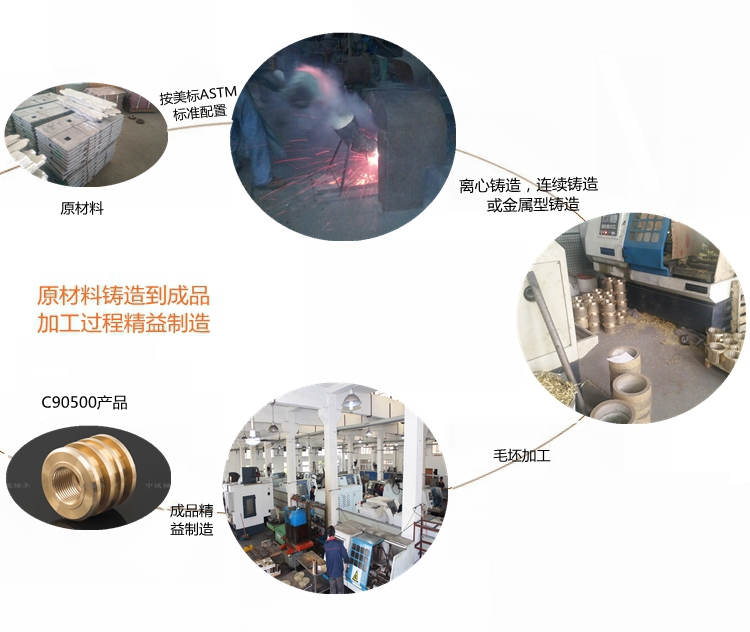 本產(chǎn)品實(shí)行ASTM標(biāo)準(zhǔn)………………………………………………… 根據(jù)客戶產(chǎn)品需求我們提供的鑄造方式有:離心鑄造,連續(xù)鑄造和金屬型鑄造?!?牌號C90500合金銅化學(xué)成分:Cu86-89 Sn9-11 Pb0.3 Zn1-3 Fe0.2 Al0.005 Si0.005 Ni1 Sb0.2 P1.5 S0.05………………對比國內(nèi)相近牌號:ZCnSn10Zn2